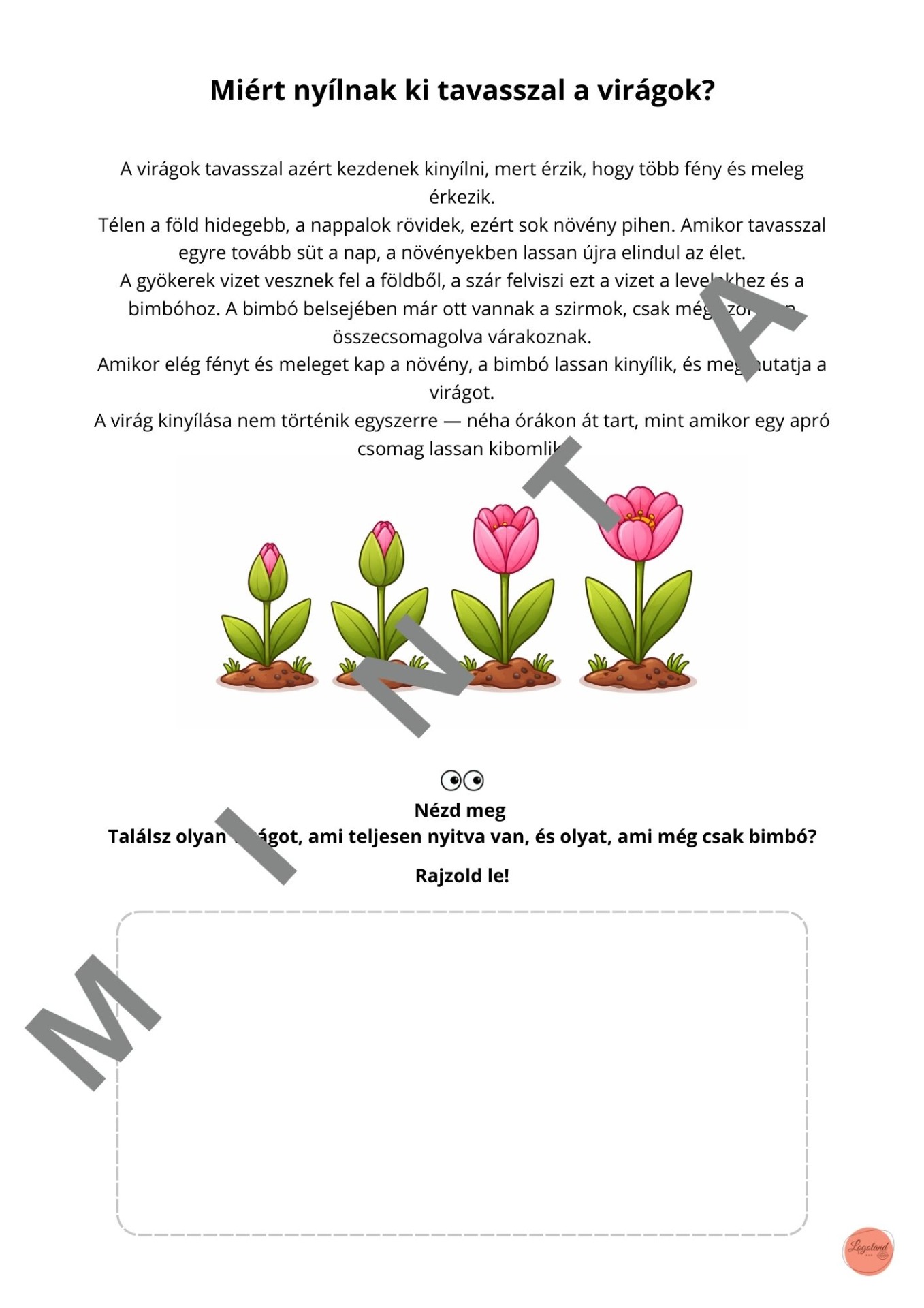 A feladatok a tavaszi természet legizgalmasabb jelenségeit mutatják meg gyereknyelven: